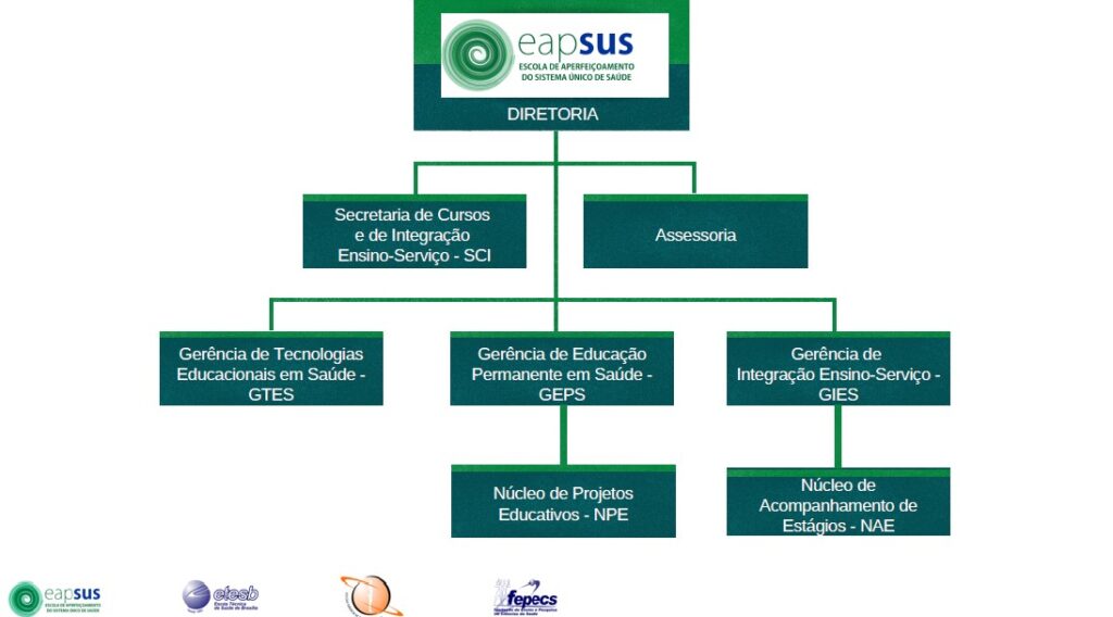 A Escola de Aperfeiçoamento do Sistema Único de Saúde (EAPSUS), mantida pela Fundação de Ensino e Pesquisa em Ciências da Saúde (FEPECS) foi criada em 22 de agosto de 2013, pelo Decreto nº 34.593, teve seu Regimento Interno publicado pela Ordem de Serviço Nº 61 de 13 de setembro de 2022, no DODF Nº 178 de 21 de setembro de 2022. Atualmente, a EAPSUS é dirigida pela servidora da SES-DF, Dra. Fernanda Ramos Monteiro, e possui em sua estrutura administrativa, três gerências e uma Secretaria de cursos, a saber: Gerência de Integração Ensino-Serviço gerida por Verônica Lobo Ferreira de Assis sendo responsável pelas atividades práticas curriculares, Gerência de Educação Permanente em Saúde gerida por Maiza Caroline Salles sendo responsável pelas atividades educativas presenciais e treinamento em serviço, Gerência de Tecnologias Educacionais em Saúde gerida por Elizabeth Moura Panisset Caiuby sendo responsável pelas atividades EAD e híbridas e Secretária de Cursos e de Integração Ensino-Serviço responsável por realizar ações administrativas relativas à secretaria.