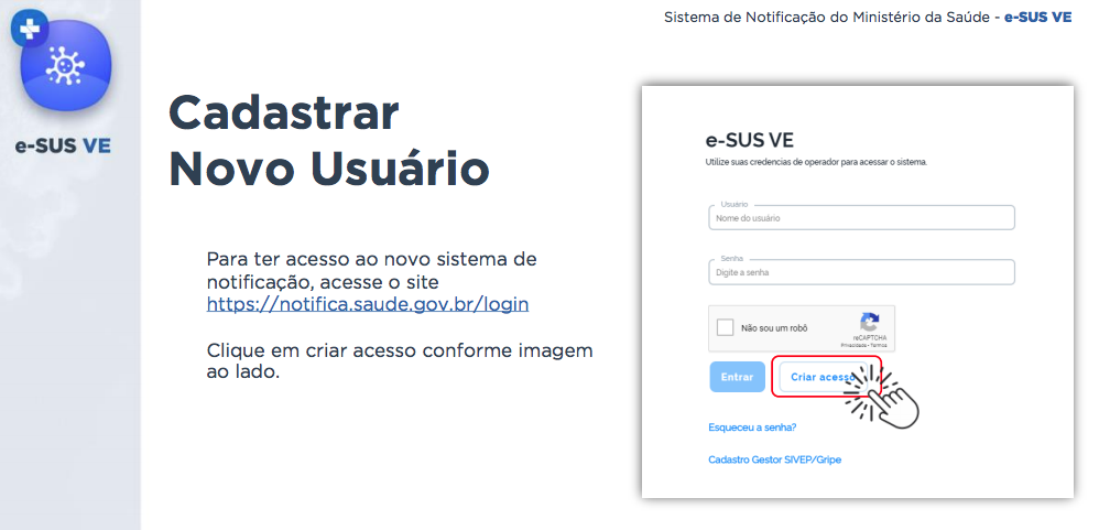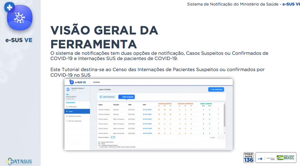 Este registro deverá ser feito no sistema e-SUS VE, desenvolvido e disponibilizado pelo Departamento de Informática do SUS (DataSUS) exclusivamente para atender a alta demanda de notificações devido ao Covid-19.