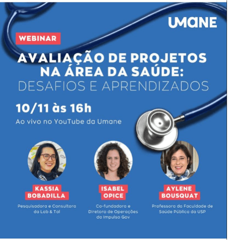 O webinário é promovido apoiado pela Umane, uma associação civil sem fins lucrativos, isenta e independente voltada a articular e fomentar iniciativas de apoio ao desenvolvimento do sistema de saúde, prevenção de doenças e promoção da saúde, tem como objetivo destacar a importância da avaliação de projetos para o aprimoramento da saúde pública no Brasil.