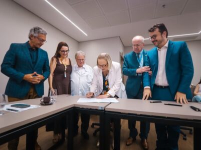 Acompanhada pelo secretário-chefe da Casa Civil, Artur Lemos, a secretária da Saúde, Arita Bergmann, anunciou novos investimentos estaduais destinados à Santa Casa de Misericórdia de Porto Alegre para qualificar a assistência materno-infantil e ampliar o acesso a tecnologias avançadas.