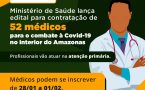 As equipes do Ministério da Saúde estão no Amazonas há mais de 20 dias, com apoio em diversas frentes de atuação no enfrentamento da pandemia. A iniciativa de contratação dos médicos aconteceu com base na análise do cenário local. Esse diagnóstico técnico detectou que a principal deficiência no Amazonas, no contexto da pandemia, é a falta destes profissionais. Assim, o Ministério da Saúde solicitou abertura de editais emergenciais para provimento desses trabalhadores.