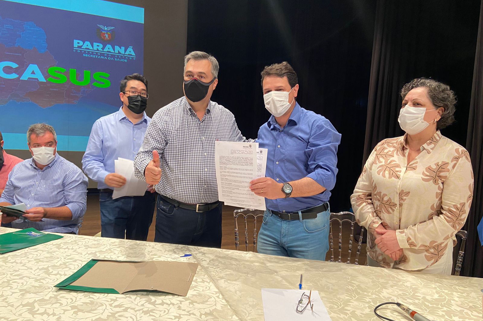 PRESENÇAS – Participaram do encontro o diretor-geral da Sesa, Nestor Werner Junior; o prefeito de Marilândia do Sul e presidente da Associação dos Consórcios e Associações Intermunicipais de Saúde do Paraná (Acispar) e Consórcio Paraná Saúde, Aquiles Takeda Filho; o prefeito de Apucarana, Junior da Femac; o diretor da 16ª Regional, Marcos Costa; e autoridades dos municípios de abrangência.