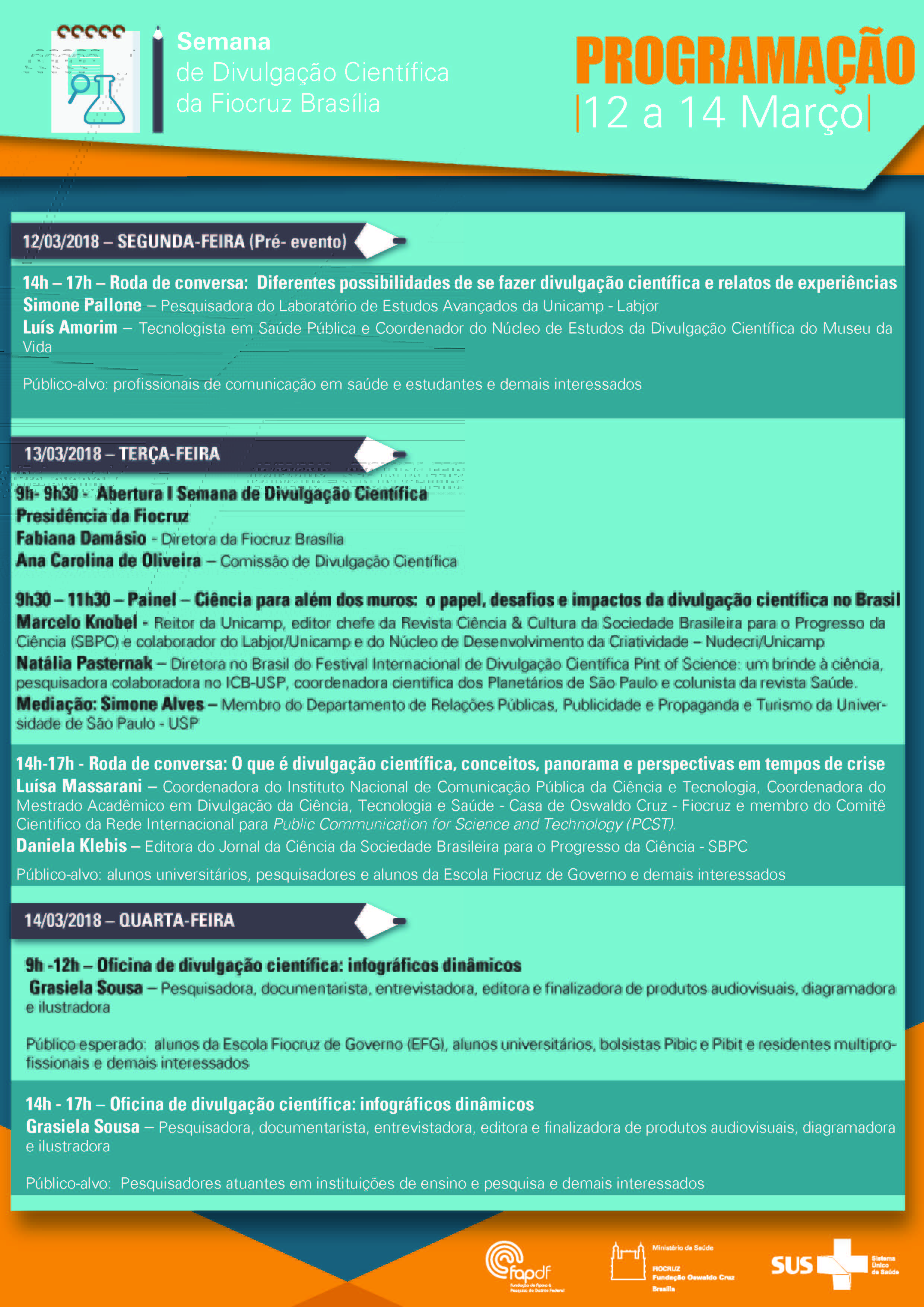 Os participantes poderão aprender sobre divulgação científica também na prática, com as oficinas para a criação de infográficos dinâmicos, no dia 14 de março, quarta-feira. Confira a programação completa. A atividade é realizada pela Comissão de Divulgação Científica da Fiocruz Brasília e financiado pela Fundação de Apoio à Pesquisa do Distrito Federal. Confira a programação completa.