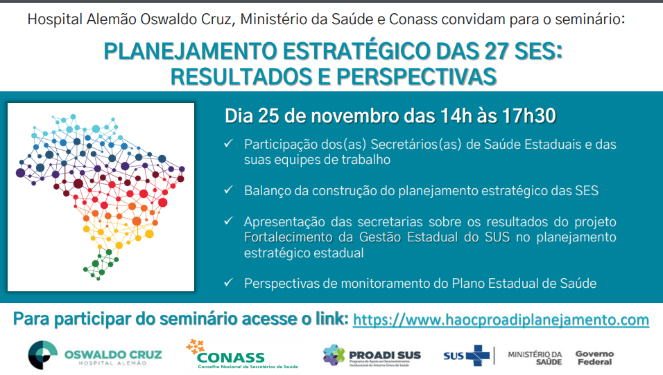 Nesta quarta-feira (25), o Hospital Alemão Oswaldo Cruz, o Ministério da Saúde e o Conass realizam o seminário “Planejamento Estratégico das 27 SES: Resultados e Perspectivas”.