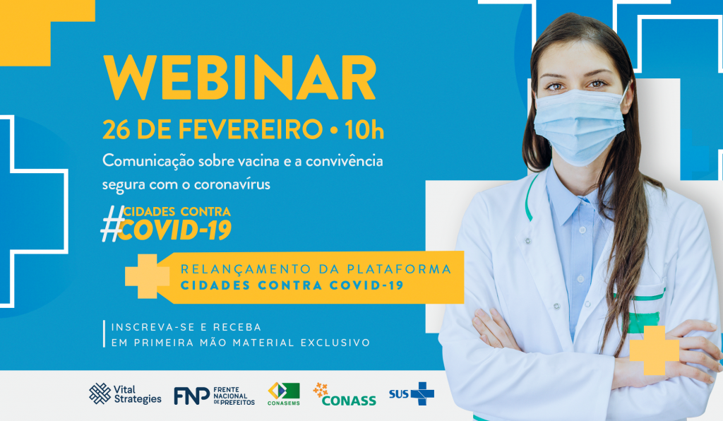 O relançamento da Plataforma Cidades Contra Covid-19 acontece nesta sexta-feira (26) às 10h com o seminário “Comunicação sobre vacina e a convivência segura com o coronavírus”. O debate sobre comunicação de risco será conduzido pela vice-presidente sênior de Comunicação da Vital Strategies, Sandra Mullin e pelo vice-presidente de Parcerias Estratégicas da FNP, Roberto Cláudio.