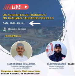 Finalizando as atividades do ano, junto ao SAMU e Liga acadêmica de Traumas do Centro Universitário em Lagarto (UNIAGES) houve uma live com o tema “Os acidentes de trânsito e os Traumas causados por ele”, com o objetivo informar a população sobre os traumas ocasionados por acidentes e como preveni-los, como também tivemos a elaboração do segundo Informe Epidemiológico analisando os óbitos entre 2015 á 2019, focando nas regiões de saúde e municípios, como também no perfil das vítimas dos acidentes de trânsito.