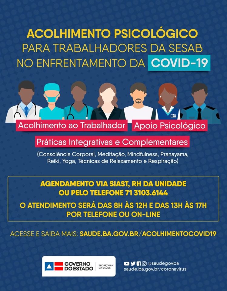 Tendo em vista o momento de crise que a sociedade enfrenta, em razão da pandemia provocada pela Covid-19, a Sesab, por meio de sua Superintendência de Recursos Humanos, decidiu implantar o serviço de Acolhimento psicológico para trabalhadores da Sesab. O atendimento acontecerá de forma virtual, com o objetivo de ofertar serviços de acolhimento, orientação, apoio psicológico pontual e/ou breve e práticas integrativas à distância para trabalhadores da Sesab.