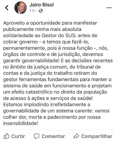 A mobilização também ganha apoio de autoridades ligadas a outros órgãos públicos. O promotor de Justiça do MPDFT Jairo Bisol se manifestou pelas redes sociais. Ele defendeu que órgãos de controle e jurisdição devem garantir a governabilidade. Acrescentou que decisões recentes no âmbito da Justiça comum, do Tribunal de Contas e da Justiça do Trabalho retiram do gestor do SUS as ferramentas para manutenção do sistema de saúde em funcionamento. “Estamos implodindo irrefletidamente a governabilidade de um sistema carente: vamos colher dor, morte e padecimento por nossa insensibilidade”, diz.
