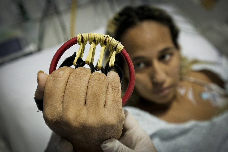 “Estamos acompanhando esta paciente que, em duas semanas, já recuperou grande parte dos movimentos. Ela tentava se alimentar sozinha, mas ficava bastante estressada. Após trabalharmos a mobilidade dos membros e o fortalecimento dos músculos, ela passou a ter mais força para puxar os elásticos e está quase conseguindo realizar estes movimentos sozinha”, informa a terapeuta ocupacional.