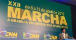 A XXII Marcha a Brasília em Defesa dos Municípios ocorre, em Brasília, entre os dias 8 e 11 de abril. Trata-se de mobilização organizada pela Confederação Nacional dos Municípios (CNM) desde 1998 para discutir questões que influenciam o dia a dia dos municípios, além de debater e apresentar reivindicações do movimento municipalista. Reune anualmente cerca de 5 mil participantes, entre prefeitos, secretários municipais, vereadores, senadores, governadores e parlamentares estaduais e federais, além de ministros de Estado.
