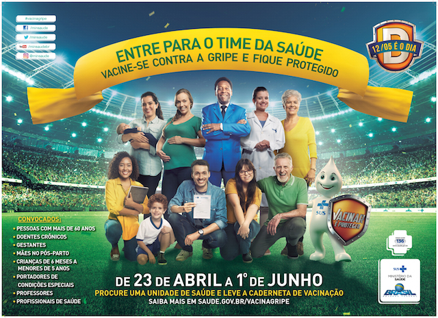 Neste ano, a Campanha Nacional de Vacinação contra a Influenza tem como padrinho o ex-jogador de futebol Pelé, que vai convocar todos os públicos a se protergerem da gripe. Com o slogan “Entre para o time da saúde. Vacine-se contra a gripe e fique protegido”, o Rei do Futebol convoca o grupo prioritário a proteger contra a gripe. A campanha publicitária será exibida em TV aberta, rádio, nos meios impresso (jornais e revistas), mídia exterior (busdoor, placas em ruas e avenidas, abrigo de ônibus, metrô), no meio online (internet e com ações nas redes sociais).