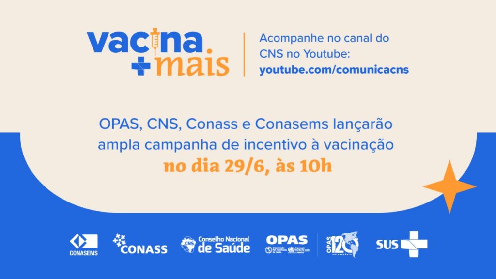 O Conselho Nacional de Saúde (CNS), o Conselho Nacional de Secretários de Saúde (Conass), o Conselho de Secretarias Municipais de Saúde (Conasems) e a Organização Pan-Americana da Saúde/Organização Mundial da Saúde (OPAS/OMS) se uniram para promover uma ampla campanha de incentivo à vacinação. O lançamento do “Vacina Mais” será na quarta (29/06), às 10h, na sede da OPAS/OMS, em Brasília. O evento será transmitido ao vivo no canal do CNS no YouTube.