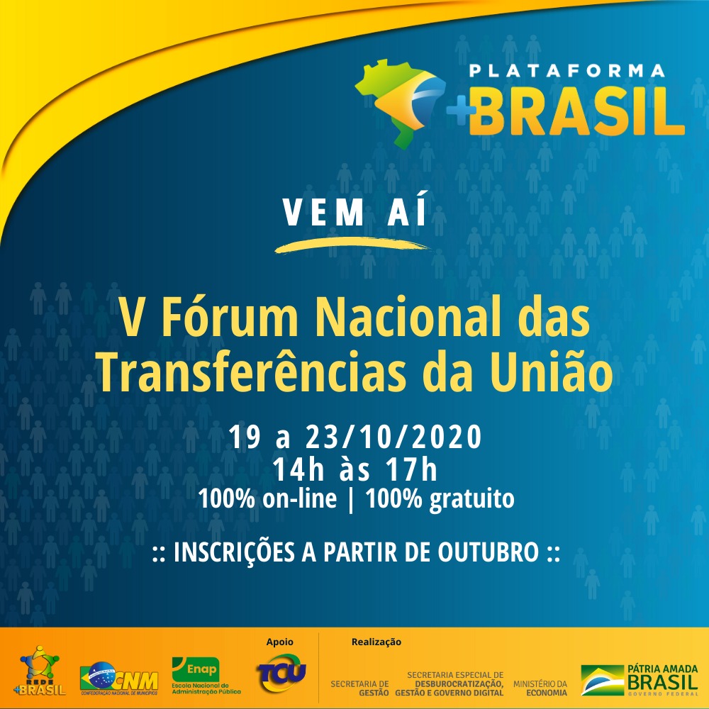 Vem aí o V Fórum Nacional das Transferências da União (FNTU), evento 100% on-line e gratuito, promovido entre os dias 19 e 23 de outubro de 2020, pela Secretaria de Gestão, da Secretaria Especial de Desburocratização, Gestão e Governo Digital, do Ministério da Economia, por meio do Departamento de Transferências da União.