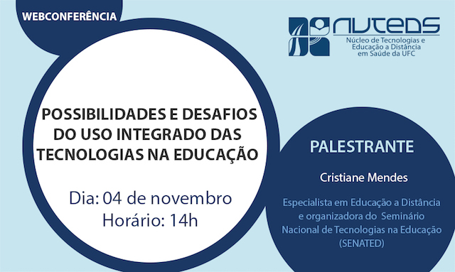 O Núcleo de Tecnologias e Educação a Distância em Saúde da Universidade Federal do Ceará (NUTEDS/UFC) realiza na próxima sexta-feira, dia 04 de novembro, às 14h, nova edição do Ciclo de Palestras com a webconferência “Possibilidades e Desafios do uso integrado das Tecnologias na Educação“.