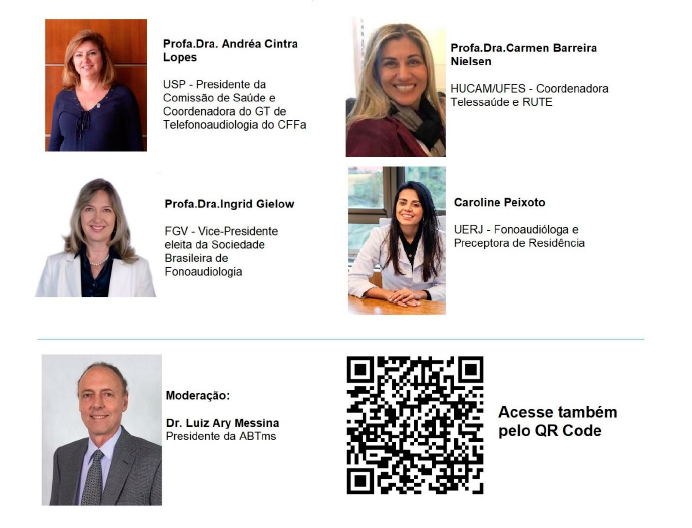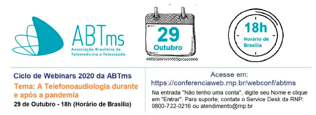 O próximo webinar será “A Telefonoaudiologia durante e após a pandemia” com o Conselho Federal de Fonoaudiologia (CFFa), a Sociedade Brasileira de Fonoaudiologia (SBFa), UERJ, UFES. Será no dia 29/10 às 18hs em http://mconf.rnp.br/webconf/abtms.